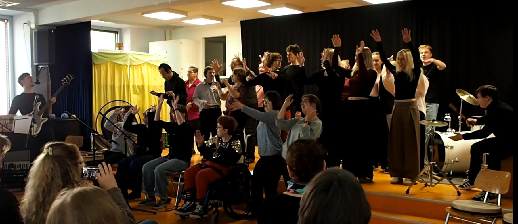 Am 7. Februar 2026 standen Kursteilnehmende der Lebenshilfe Freiburg, Schülerinnen und Schüler aus dem Wahlpflichtfach Musikpädagogik (Erzieher/-innenausbildung) sowie die Projektleitungen Susanne Lotz und Ingrid Kloos auf der Bühne der Merian-Schule.